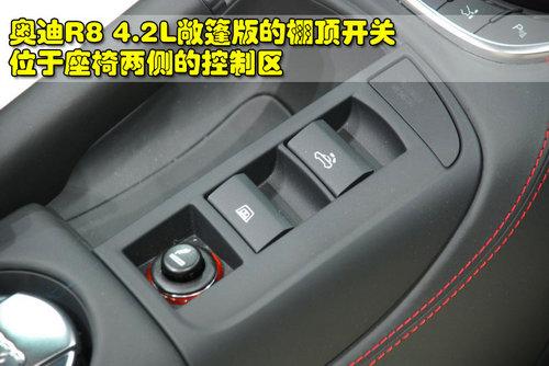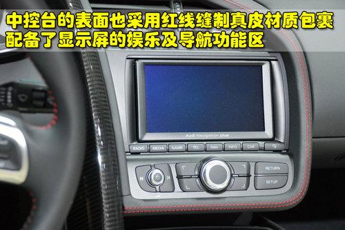 奧迪R8 4.2L敞篷版的中控臺(tái)周圍都采用真皮包裹,并且紅線縫制顯得運(yùn)動(dòng)感更強(qiáng)。中控臺(tái)兩側(cè)都采用了輕量化碳纖維裝飾板。中控臺(tái)頂部配備了大尺寸顯示屏,娛樂功能和導(dǎo)航功能都一應(yīng)俱全。奧迪R8 4.2L敞篷版的頂棚開關(guān)位于中央扶手前的位置,獨(dú)立的設(shè)計(jì)方便方便駕駛員或操作。