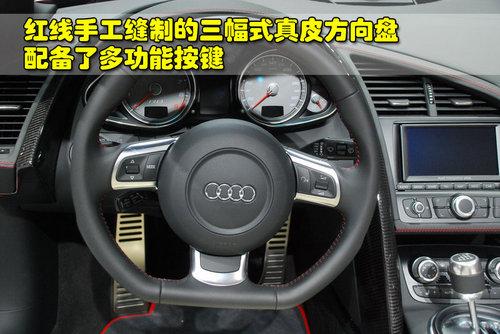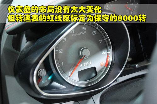 奧迪R8 4.2L敞篷版采用的是紅線手工縫制的三幅式真皮方向盤,并且配備了多功能按鍵。儀表盤的布局與5.2L車型并沒有太多變化,但由于引擎動(dòng)力的減弱,轉(zhuǎn)速表的紅線區(qū)標(biāo)定為相對(duì)比較保守的8000轉(zhuǎn)。