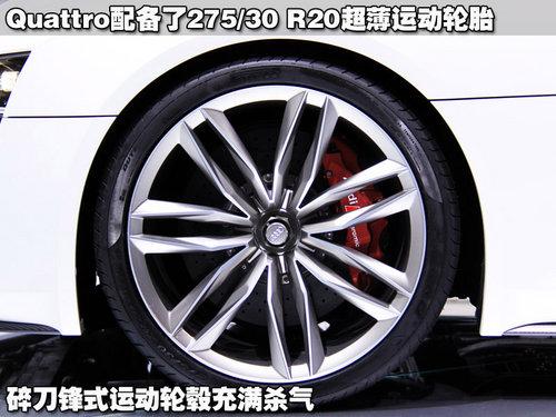一款以“跑”見長的車,必須擁有一雙好鞋,奧迪Quattro概念車配備了275/30 R20超薄運動輪胎,紅色卡鉗自然是必備的配置。最讓人感到震撼的便是奧迪Quattro概念車配備的7幅式雙條紋碎刀鋒式輪轂,造型動感十足,給人它可以將所有路面斬碎,跑在第一的位置。