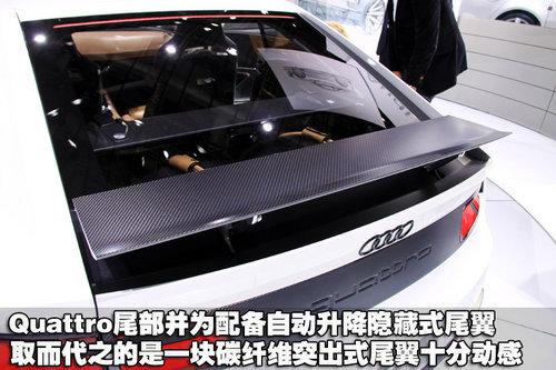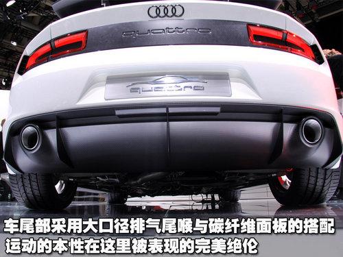 車尾部奧迪Quattro概念車除了車漆意外,基本全部被碳纖維包裹,甚至武裝到了排氣尾喉上,全碳纖維后保險杠的風(fēng)格讓車輛的運動感瞬間提升了一個檔次。