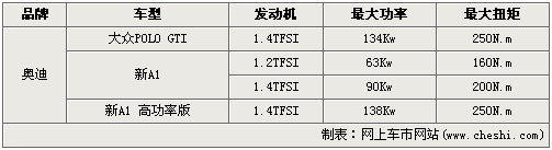從表中可以看出,巴黎車展奧迪帶來的高功率版A1搭載的1.4TFSI擁有“缸內直噴+機械曾也+渦輪增壓”三項技術,經過特殊調教,功率超過大眾POLO GTI有4Kw,達到138Kw,為小型車功率之冠;最大扭矩達到250N.m。百公里加速僅為6.9秒,是一款名副其實的勁量小鋼炮。
