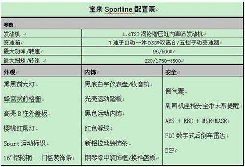 在配置上,寶來Sportline也增添了不少新意。除了原有的倒車雷達、定速巡航、防盜報警裝置等配置外,還新增了ESP和側氣囊,副司機座椅安全帶未系提醒、RPDC數(shù)字式后倒車雷達等標準配置。