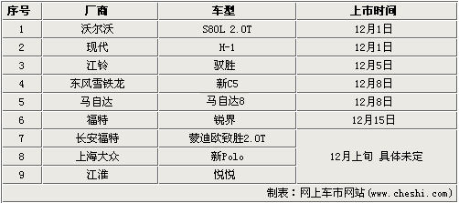 其中,在12月1日就將有兩款新車上市,分別為S80L 2.0T和現(xiàn)代H-1,另外還有江鈴馭勝、新C5、馬自達8等三款新車也確定了具體上市時間,而江淮悅悅、新Polo、GX2等4款車上市時間未定。從上表可以看到,這9款新車涵蓋了小型車、中級車、豪華車、SUV及商務(wù)車等不同類型,可以滿足消費者各項用車需求。