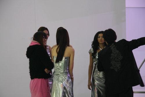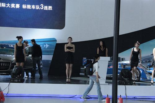 接下來看到的是標致展臺,模特已經嚴陣以待,進入了彩排階段,正式服裝已經上身,黑色的套裙裝體現性感的一面。美女們站一排,有點眼花繚亂啊。