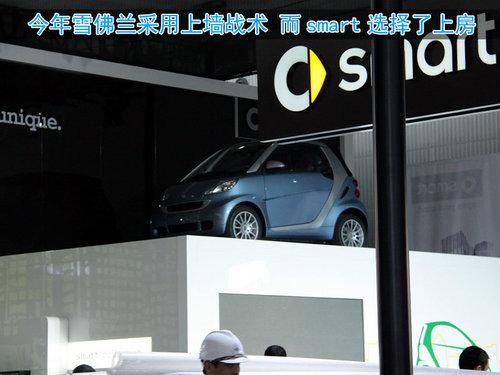 為了吸引觀眾的眼球,各個廠商也費勁了心思布展,雪佛蘭看上了歷年MINI的絕招,就是把車掛在墻上,而Smart則直接將車擺上了房頂。這使我不得不去聯(lián)想下屆車展會不會倒掛在房頂上?車展吸引人的地方有很多,其中就包括我們在這里可以親眼看到一些神車,例如我們眼前的尚酷R,這個版本在中國來說目前沒有銷售。