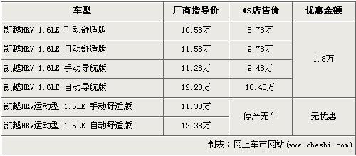 據(jù)經(jīng)銷商處銷售人員介紹,凱越HRV共有6個車型,由于運動版車型現(xiàn)已停產(chǎn),經(jīng)銷店內(nèi)已經(jīng)沒有現(xiàn)車,所以在售的車型只有舒適版和導(dǎo)航版共4款車型。近期購買凱越HRV的消費者可以得到1.8萬元的現(xiàn)金優(yōu)惠,經(jīng)優(yōu)惠后,入門級的1.6LE手動舒適版車型售價從廠商指導(dǎo)價10.58萬元跌至8.78萬元。