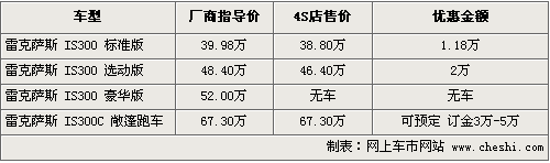 據(jù)4S店銷售人員介紹,目前雷克薩斯IS300系列有普通轎車和敞篷硬頂跑車兩個系列,其中敞篷跑車的售價已經(jīng)公布,售價為67.3萬元,各經(jīng)銷商處可以接受預(yù)訂,訂金為3萬-5萬不等,7月首批新車即可到店。據(jù)銷售人員介紹哦G-BOOK智能副駕系統(tǒng)是這款車的最大亮點。同時轎車版三款車目前只有IS300選動版現(xiàn)車供應(yīng),最高可優(yōu)惠現(xiàn)金2萬元。同時,部分經(jīng)銷商還推出了購車送一年全車保險的活動,保險金額在1萬-2萬之間。