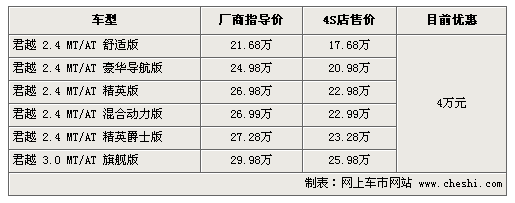 據(jù)4S店銷售人員介紹:由于新君越臨近上市,所以目前銷售的君越有大幅降價(jià),最高降幅達(dá)到4萬元。目前除了混合動(dòng)力版需預(yù)定外,其他車型貨源充足,全系優(yōu)惠4萬元;旌蟿(dòng)力版預(yù)訂需等一個(gè)月時(shí)間,訂金1萬元。