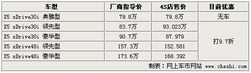 據(jù)4S店銷售人員介紹:目前寶馬X5除3.0升典雅型無車外,其它車型可打9.7折,最大優(yōu)惠達(dá)5.2萬元之多。但是目前X5無現(xiàn)車,預(yù)定最短需等一個(gè)半月,4.8升車型最長(zhǎng)需等半年。雖然目前X5優(yōu)惠幅度較之前有所縮水,但目前無現(xiàn)車的狀態(tài)能有小幅優(yōu)惠也算是一個(gè)小的驚喜。