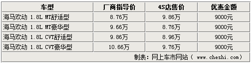 經(jīng)銷商表示,海馬歡動1.8L排量車型,最低配的手動舒適型售價8.76萬,最高配的自動(CVT)豪華型售價10.66萬,優(yōu)惠金額均為9千元,除現(xiàn)金優(yōu)惠外還會有相應(yīng)的裝飾贈送,F(xiàn)金優(yōu)惠配合購置稅優(yōu)惠,則大大減輕了消費(fèi)者的購車負(fù)擔(dān)。