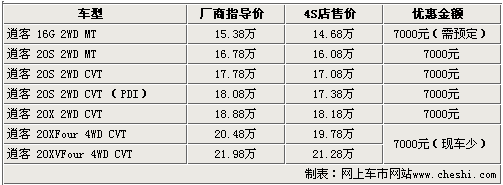 東風(fēng)日產(chǎn)推出的逍客車型是在國(guó)內(nèi)第一款真正意義上的跨界車,這款車既擁有SUV的時(shí)尚外觀和通過性,又有轎車的舒適性和省油優(yōu)勢(shì)。根據(jù)網(wǎng)上車市價(jià)格監(jiān)測(cè)系統(tǒng)顯示,目前在北京地區(qū)購(gòu)買逍客的消費(fèi)者,可以享受到全系7000元的現(xiàn)金優(yōu)惠,但是1.6L車型需預(yù)定。具體車型以及價(jià)格如下: