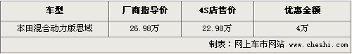 隨著油價(jià)的不斷上調(diào),消費(fèi)者的用車(chē)成本不斷增加,混合動(dòng)力車(chē)型開(kāi)始成為許多消費(fèi)者選購(gòu)的對(duì)象,其中本田進(jìn)口的混合動(dòng)力版思域在性價(jià)比方面逐漸凸顯其優(yōu)勢(shì),目前筆者了解,這款車(chē)最高優(yōu)惠幅度達(dá)到了4萬(wàn)元,優(yōu)惠后與普通車(chē)型差距逐漸減小,具體車(chē)型以及價(jià)格如下: