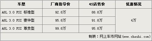 據(jù)北京奧迪經(jīng)銷店銷售人員介紹,目前奧迪A8L的3.0L車型有4萬元的優(yōu)惠。經(jīng)優(yōu)惠后,3.0L標(biāo)準(zhǔn)型的售價從92.8萬下降到了88.8萬元,3.0L豪華型的售價從95.8萬元下降到了91.8萬元,3.0L尊貴型的售價也從99.8萬元下降到了95.8萬元。銷售人員還介紹,店內(nèi)目前沒有現(xiàn)車,欲購買的消費(fèi)者需交2萬元訂金,本月月底可提車。