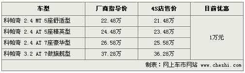 據(jù)雪佛蘭4S店銷售人員介紹:目前2.4升排量車型現(xiàn)車較為充足,顏色較齊全,白色、銀色現(xiàn)車很多,但無紅色車型,如預(yù)定需要等待1-2周時(shí)間。3.2車型依舊無現(xiàn)車,訂車需等一個(gè)月時(shí)間?婆疗嫒的壳翱蓛(yōu)惠1萬元現(xiàn)金,不送任何裝飾。