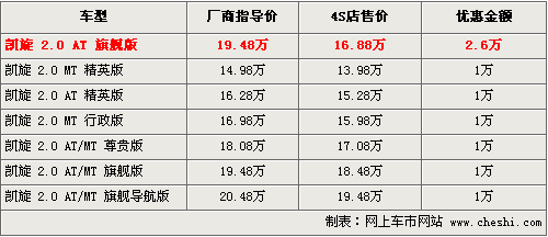 東風(fēng)雪鐵龍凱旋在同級別車型中性價(jià)比較高,前沿的中控臺設(shè)計(jì),中央集控式方向盤、EPS+GPS導(dǎo)航等豐富的配置均在凱旋上能夠看到。根據(jù)網(wǎng)上車市價(jià)格檢測系統(tǒng)顯示,目前個(gè)別商家針對凱旋推出了特價(jià)車型,優(yōu)惠幅度達(dá)2.6萬元,并可以獲得部分禮品,具體車型和價(jià)格如下: