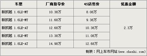 據(jù)4S店銷(xiāo)售人員介紹,新凱越分為1.6L與1.8L兩種排量車(chē)型,目前新凱越全系優(yōu)惠2.3萬(wàn)元,較上個(gè)月的優(yōu)惠降幅有所上升。經(jīng)優(yōu)惠后,全系最低配的1.6LX-MT車(chē)型售價(jià)下降到了8.08萬(wàn)元。經(jīng)優(yōu)惠后,1.8L手動(dòng)和自動(dòng)兩款車(chē)型售價(jià)也下降到了11.08萬(wàn)元和12.68萬(wàn)元。銷(xiāo)售人員還介紹,目前店內(nèi)現(xiàn)車(chē)齊全,是消費(fèi)者挑選的較好時(shí)機(jī)。