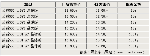 據(jù)銷售人員表示,目前購買1.8T榮威550車型全系可以優(yōu)惠1.3萬元,并加贈超值的保養(yǎng)及裝飾,同時,各店1.8L的榮威550車型也相當(dāng)充裕,顏色齊全,購車用戶可享受最高1萬元的優(yōu)惠。其他4S店也基本維持在這個優(yōu)惠基礎(chǔ)之上進(jìn)行銷售,不論是1.8T還是1.8L車型均可滿足消費者的購車挑選需要。