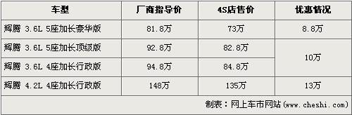 據(jù)北京進(jìn)口大眾經(jīng)銷店銷售人員介紹,目前輝騰3.6L 5座加長豪華版有8.8萬元的現(xiàn)金優(yōu)惠,經(jīng)優(yōu)惠后3.6L 5座加長豪華版的售價降到了73萬元,跌破了75萬元。排量稍大的4.2L 4座加長行政版有13萬元的優(yōu)惠,經(jīng)優(yōu)惠后售價從148萬元下降到了135萬元。銷售人員還介紹,4.2L輝騰沒有現(xiàn)車,欲購買的消費(fèi)者需交訂金10萬元預(yù)訂。