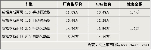 據(jù)北京福特4S店銷售人員介紹:目前購買兩廂?怂沟南M者最高可以得到1.4萬元的優(yōu)惠。1.8L手動舒適版經(jīng)1.4萬元優(yōu)惠后,售價降到了10.49萬元。1.8L自動時尚版以及2.0L的運動版車型有1.2萬元的優(yōu)惠,優(yōu)惠后售價分別降到了12.29萬元、13.59萬元和14.19萬元。