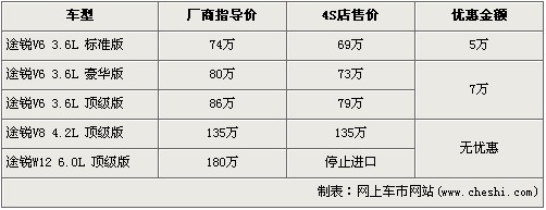 途銳是大眾首款引進我國的SUV車型,在3.6L及4.2L率先上市后,大眾為了滿足消費者的更大胃口,緊接著又推出了搭載12缸發(fā)動機的6.0L車型。隨著大排量消費稅的頒布,給9月份后入關的大排量車型帶來了一次不小的沖擊,令大排量汽車價格都上調了不少。近日據(jù)網(wǎng)上車市價格系統(tǒng)監(jiān)測顯示,大眾途銳的6.0L車型已經(jīng)停止進口,并且購買目前購車可以得到最高7萬元的優(yōu)惠,具體詳情請看下表: