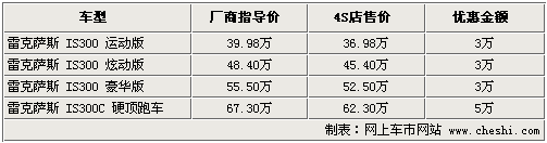 據(jù)4S店銷售人員介紹,目前雷克薩斯IS300供應(yīng)的車型均為2010款,新款車型比老款增加了諸多配置,性價(jià)比更高。同時(shí)現(xiàn)車方面,入門級(jí)和炫動(dòng)版車型的現(xiàn)金優(yōu)惠為3萬元,豪華版暫時(shí)沒有現(xiàn)車,需要預(yù)訂。硬頂敞篷跑車IS300C的優(yōu)惠幅度則達(dá)到了5萬元。