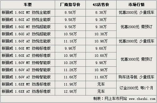 東風(fēng)日產(chǎn)旗下的新款兩廂轎車——新驪威于3月25日正式上市,售價(jià)為8.58-12.98萬(wàn)。新驪威分別搭載1.6L引擎和1.8L引擎的新車,由于配置和動(dòng)力差異共分為12款車型。新驪威在外形上更具動(dòng)感活力,整體質(zhì)感和產(chǎn)品體系競(jìng)爭(zhēng)力也有進(jìn)一步提升。根據(jù)網(wǎng)上車市價(jià)格監(jiān)測(cè)系統(tǒng)顯示,新驪威剛剛上市就有了3000元現(xiàn)金的優(yōu)惠,并有少量現(xiàn)車供應(yīng)。具體車型行情如下: