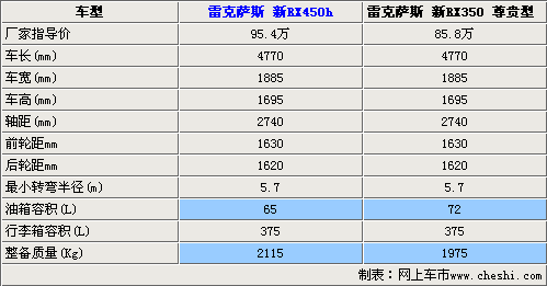 雷克薩斯新RX350和RX450h的售價(jià)相差了將近10萬(wàn)元。兩款車型的車身尺寸完全一樣,軸距也都到達(dá)到了2740mm,這些數(shù)據(jù)都確保了它們擁有著寬敞的內(nèi)部空間。兩款車型的最小轉(zhuǎn)彎半徑都是5.7m,確保了它們?cè)讵M窄道路上的通過性能。在油箱方面,由于RX450h為混合動(dòng)力車型,所以油箱容積要比汽油版車型小,只達(dá)到了65升。但是由于RX450h自身攜帶了大通量電池和電動(dòng)馬達(dá),所以自身重量要高于汽油版車型。