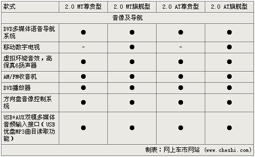 在音像及導(dǎo)航配置方面,差別同樣不大,尊貴型與旗艦型的差別只是移動(dòng)數(shù)字電視,其他如DVD導(dǎo)航及音響播放器、6喇叭揚(yáng)聲器等,應(yīng)該說(shuō)是非常齊備的音響系統(tǒng)了。