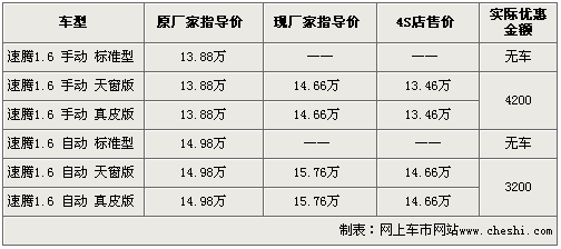 速騰作為一汽大眾新一代“A級”車生產(chǎn)平臺的產(chǎn)物,上市當(dāng)初憑借全系車型標(biāo)配ESP電子穩(wěn)定程序而成為統(tǒng)計標(biāo)桿。隨著國家對1.6及以下排量車型減免一半購置稅政策的出臺,速騰1.6車型更受到消費者的追捧。據(jù)網(wǎng)上車市價格監(jiān)測系統(tǒng)顯示,速騰1.6排量全系車型廠家指導(dǎo)價格上調(diào),優(yōu)惠幅度降低。相關(guān)車型及價格如下表所示: