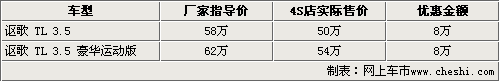 09新款的謳歌TL在去年12月份正式進(jìn)入國(guó)內(nèi)市場(chǎng)銷(xiāo)售,相比之前老款車(chē)型,09款在外觀、性能、排量上均有不同程度的提升。近日謳歌為了可以更好的適應(yīng)中國(guó)市場(chǎng)的需求推出了TL豪華運(yùn)動(dòng)版車(chē)型,售價(jià)62萬(wàn)元。與此同時(shí)根據(jù)網(wǎng)上車(chē)市價(jià)格監(jiān)測(cè)系統(tǒng)顯示,目前購(gòu)買(mǎi)TL均可以得到8萬(wàn)元的現(xiàn)金優(yōu)惠,其中也包括剛剛推出的豪華運(yùn)動(dòng)版。具體車(chē)型售價(jià)見(jiàn)下表: