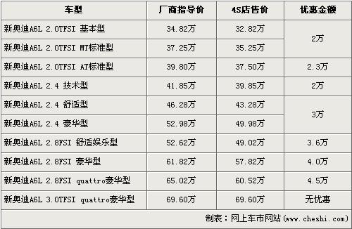 據(jù)4S店銷(xiāo)售人員介紹,目前奧迪A6L全系可以最高優(yōu)惠4.5萬(wàn)元。奧迪A6L全系分為2.0TFSI,2.4L,2.8FSI,3.0TFSI四種共10個(gè)車(chē)型,最低配的2.0TFSI基本型經(jīng)2萬(wàn)元優(yōu)惠后售價(jià)從34.82萬(wàn)元下降到了32.82萬(wàn)元,而2.8TSI quattro豪華版經(jīng)全系最高的4.5萬(wàn)元優(yōu)惠后售價(jià)也降到了60.52萬(wàn)元。全系最高配的3.0TFSI quattro豪華版目前店內(nèi)沒(méi)有現(xiàn)車(chē),欲購(gòu)買(mǎi)的消費(fèi)者需要交1萬(wàn)元訂金,約等3個(gè)月后方可提車(chē)。