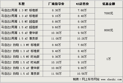 馬自達2是長安馬自達繼3系列之后又一定位更加年輕化的城市小車,Mazda2沿襲馬自達經(jīng)典的“Zoom-Zoom”設計理念,并同時結(jié)合了優(yōu)異的安全性、舒適性及燃油經(jīng)濟性表現(xiàn)。根據(jù)網(wǎng)上車市價格監(jiān)測系統(tǒng)顯示,目前全系最高可優(yōu)惠現(xiàn)金1萬元左右,具體行情如下: