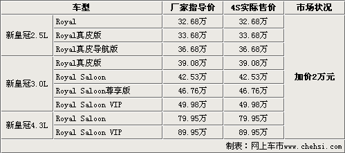 一汽豐田旗下旗艦車型新皇冠于昨日正式發(fā)布,新皇冠分別搭載了2.5L、3.0L和4.3L引擎,共計9款車型,售價32.68萬-89.95萬元;使谧鳛橐黄S田旗下旗艦版車型,自進入國內(nèi)市場以來就一直擁有較好的口碑,新皇冠無論在性能還是配置方面,較老款都有很大的提升。所以自打在國內(nèi)一亮相,就備受中國消費者的關注。同時我們也從北京地區(qū)一汽豐田4S店了解到,目前4S店內(nèi)均沒有展車,第一批車輛要到12月20號左右才會到店,消費者最早要到明年1月才能提到現(xiàn)車,而且要加價2萬元現(xiàn)金。具體車型售價見下表: