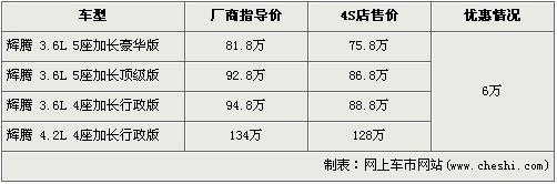 據(jù)北京進(jìn)口大眾經(jīng)銷(xiāo)店銷(xiāo)售人員介紹,目前輝騰全系有6萬(wàn)元的現(xiàn)金優(yōu)惠,經(jīng)優(yōu)惠后3.6L 5座加長(zhǎng)豪華版的售價(jià)降到了75.8萬(wàn)元。排量稍大的4.2L 4座加長(zhǎng)行政版經(jīng)優(yōu)惠后售價(jià)從134萬(wàn)元下降到了128萬(wàn)元。銷(xiāo)售人員還介紹,4.2L輝騰沒(méi)有現(xiàn)車(chē),欲購(gòu)買(mǎi)的消費(fèi)者需交訂金10萬(wàn)元預(yù)訂。
