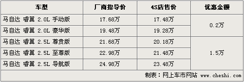 睿翼是一汽馬自達(dá)旗下的主力車型,憑借著運(yùn)動性的流線型外觀和精準(zhǔn)的操控性贏得了消費(fèi)者的青睞。目前一汽馬自達(dá)睿翼共五款車型分別覆蓋了2.0和2.5排量。根據(jù)網(wǎng)上車市價(jià)格監(jiān)測系統(tǒng)顯示:睿翼相比節(jié)前優(yōu)惠有所減少,近期最高優(yōu)惠1.5萬元。具體車型行情如下: