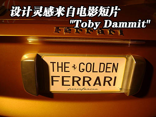 這輛黃金法拉利,除了"Golden Ferrari"這個(gè)直白的綽號(hào)外,其他部分完全未知。從外表判斷,黃金法拉利基于599 GTB,但實(shí)際上Pininfarina的設(shè)計(jì)靈感來自于某電影短片"Toby Dammit"中出現(xiàn)的法拉利330 LMB。