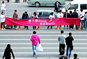 “停下來并不寂寞,跨過去成為傳說!弊蛉(27日)上午,中關村海龍大廈前面的丁字路口,十余名年輕人手持橫幅,在人行道上站成三排,組成“人肉斑馬線”,陪行人一起等紅燈;顒拥陌l(fā)起者表示,大家通過網(wǎng)絡召集,旨在用這種類似行為藝術的方式,提示人們珍愛生命,勿闖紅燈。