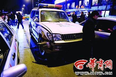 昨日下午5時(shí)30分,高新四路通往西大桃園校區(qū)的路上,一輛制式警車20米內(nèi)連撞4輛轎車。不少目擊者懷疑司機(jī)喝了酒。