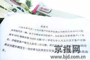 上午10時(shí)許,記者來(lái)到了位于豐臺(tái)區(qū)花鄉(xiāng)羊坊930號(hào)的金博藍(lán)汽車銷售服務(wù)公司,新車停車場(chǎng)里和展示廳內(nèi)只有4輛新車待售,偶爾還有人在看車試車。買了車卻拿不到合格證的車主陸續(xù)來(lái)到4S店,他們手中都拿著一份“承諾書”,其中承諾8月5日交付合格證,并賠償一定金額,如果違約則全款退車。