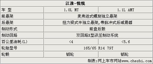 在底盤方面,江淮悅悅的前懸架采用麥弗遜式獨立懸架,后懸架為扭力梁式半獨立懸架。制動系統(tǒng)則采用前盤后鼓式,并采用雙回路X型液壓制動系統(tǒng)。另外,悅悅兩款排量的新車都采用全鋁輪轂,并采用165/65 R16尺寸的輪胎。
