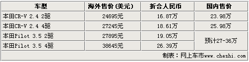 通過同屬本田旗下的SUV車型——CR-V可以看出,這款車型在美國的售價為2.46萬美元(折合人民幣約為16.87萬),而同款CR-V在國內的售價為23.98萬元,其中間差價為7萬元左右,所以我們預計這款中級SUV的售價將在27——36萬左右。