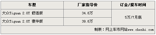 據(jù)銷售人員表示,途歡Tiguan進(jìn)口車型目前已接受預(yù)訂,訂金為5萬(wàn)元,最快在7月份左右可以提到現(xiàn)車。無(wú)論途歡Tiguan舒適版還是豪華版兩款車型,都將標(biāo)配四輪驅(qū)動(dòng)系統(tǒng)。