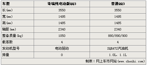 從基本參數(shù)來看,純電動(dòng)版QQ3與普通版QQ3相比,車身尺寸沒有變化,不過在車重上增加了不少,這可以看出電動(dòng)模塊還是比較重的,當(dāng)然比較特別的電動(dòng)QQ3絕對零排放,不過對于電動(dòng)模塊的參數(shù)暫時(shí)還沒有,有待進(jìn)一步的消息發(fā)布。