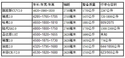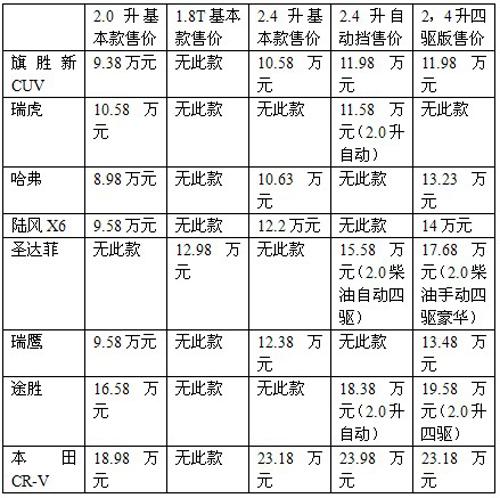 我們從廠家了解到,新旗勝已經(jīng)全面上市,動(dòng)力分為2.0升和2.4升兩個(gè)系列,分為兩驅(qū)和四驅(qū)共6個(gè)車(chē)型。外形看,這是一款頗為漂亮的車(chē)子,外形、做工和配置,與其售價(jià)很是不符。為了讓大家對(duì)其有所了解,這里把新旗勝和同級(jí)的幾款自主品牌SUV以及小一個(gè)級(jí)的SUV(比如瑞虎)做一番簡(jiǎn)單對(duì)比。為了參考的更全面,還把包括本田CR-V在內(nèi)的幾款合資車(chē)同時(shí)排列,盡管它們所面對(duì)的,并非同一個(gè)市場(chǎng),特別是像本田這樣的車(chē)型,與自主品牌相比,品牌價(jià)值差異較大,不能做直接對(duì)比,只能是個(gè)參考。