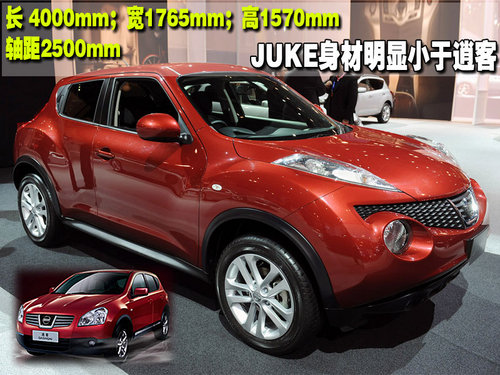 日產(chǎn)JUKE車身尺寸為:長(zhǎng)4000mm;寬1765mm;高1570mm,從車身尺寸上看,全新的Juke的明顯小于日產(chǎn)逍客Qashqai,完全符合其入門級(jí)的定位。JUKE的軸距為2500mm,比逍客短了130mm,意味著它的內(nèi)部空間將相對(duì)比較緊湊。