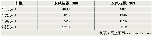 東風(fēng)標致308車身尺寸明顯超過了標致307車型,4680mm車長、1815mm的車寬和1525mm的車寬,使得標致308外形更加大氣,同時在加上2710mm的軸距,進一步確保了標致308車內(nèi)空間的寬敞,標致307的軸距僅為2612mm。
