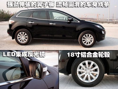 強(qiáng)勁有力的翼子板在車身中部得以適量的過(guò)度,其在車尾部再次伸張,配以車窗周圍的鍍鉻裝飾條,賦予了CX-7更為前衛(wèi)的定義。車身整體線條設(shè)計(jì)流暢圓潤(rùn),反光鏡集成了LED轉(zhuǎn)向燈,最為顯眼的當(dāng)屬輪轂,CX-7裝配了18寸多幅鋁輪轂,并配備了普利司通高級(jí)輪胎,為高速穩(wěn)定性及駕駛安全性起到了關(guān)鍵作用。