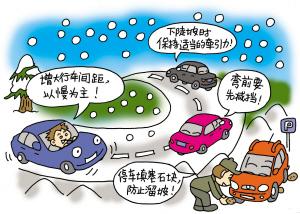 對(duì)于雪地的駕駛技巧,交警部門提醒車主,關(guān)鍵是以“慢”為主,并與前車保持足夠的剎車距離。然而,路況的復(fù)雜,讓很多駕駛員在發(fā)生側(cè)滑時(shí)感到緊張!叭绻囕v打滑,方向盤要順著打滑方向輕輕地轉(zhuǎn),待車輪回正后,再輕輕地踩剎車!薄瓣P(guān)鍵是要慢,平穩(wěn)地減速及輕踩剎車,絕對(duì)不要在冰雪濕滑的路面上猛起步,或緊急剎車。”杭城資深出租車司機(jī)師傅們紛紛提供雨雪天氣駕駛竅門。