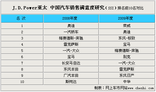 通過(guò)以上08年度與09年度的J.D. Power(亞太公司)中國(guó)汽車銷售滿意度前10名的對(duì)比我們不難看出,合資品牌還是占據(jù)了主要的位置,但日系廠商的排名有所下降。08年度的第一名奧迪意外的被自主品牌榮威所代替,寶馬提升至第4名,梅賽德斯-奔馳落后2名。而中華則闖入前10名,替代了斯柯達(dá)的位置。