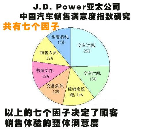 J.D. Power亞太公司在中國(guó)開(kāi)展的汽車銷售滿意度指數(shù)研究共有七個(gè)因子決定了顧客銷售體驗(yàn)的整體滿意度;根據(jù)重要性排列,分別是:交車過(guò)程、交車時(shí)間、經(jīng)銷商設(shè)施、銷售人員、書(shū)面文件、交易條件和銷售啟動(dòng)。
